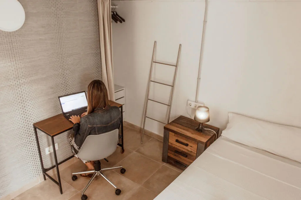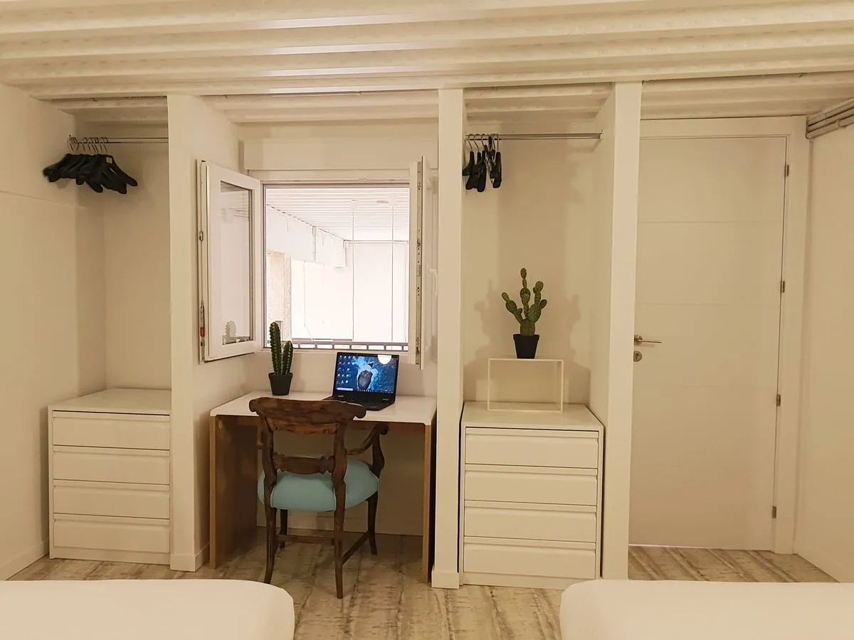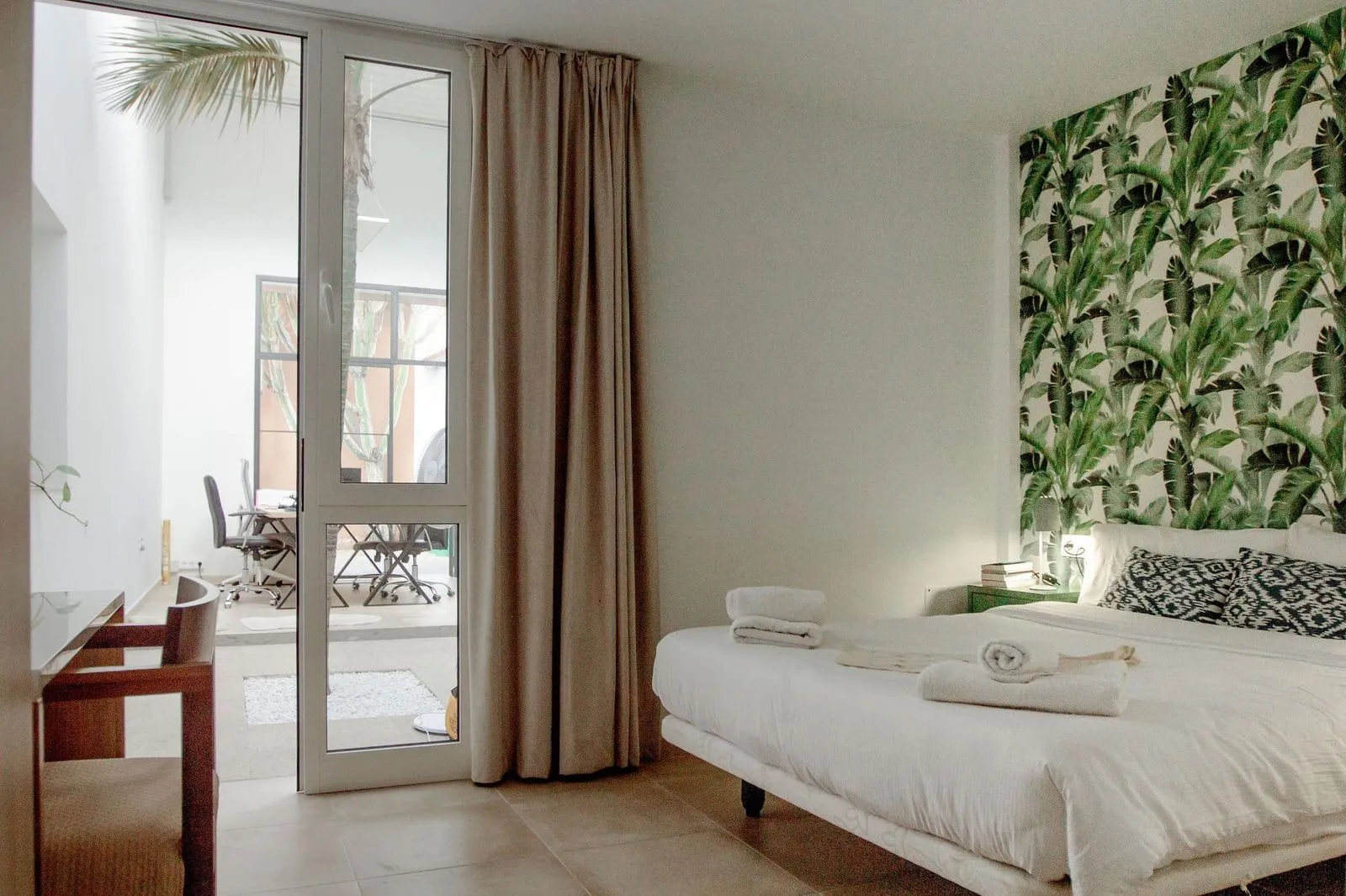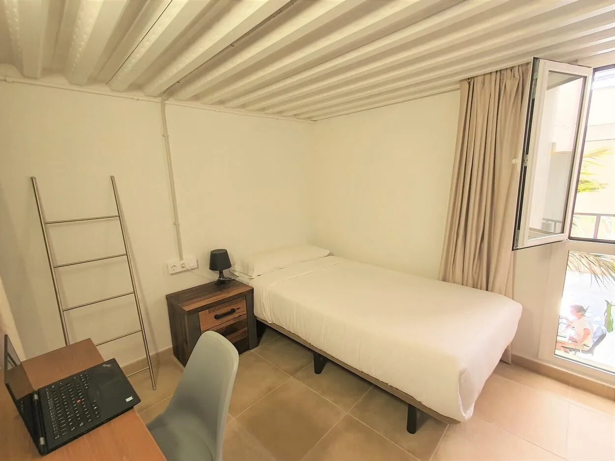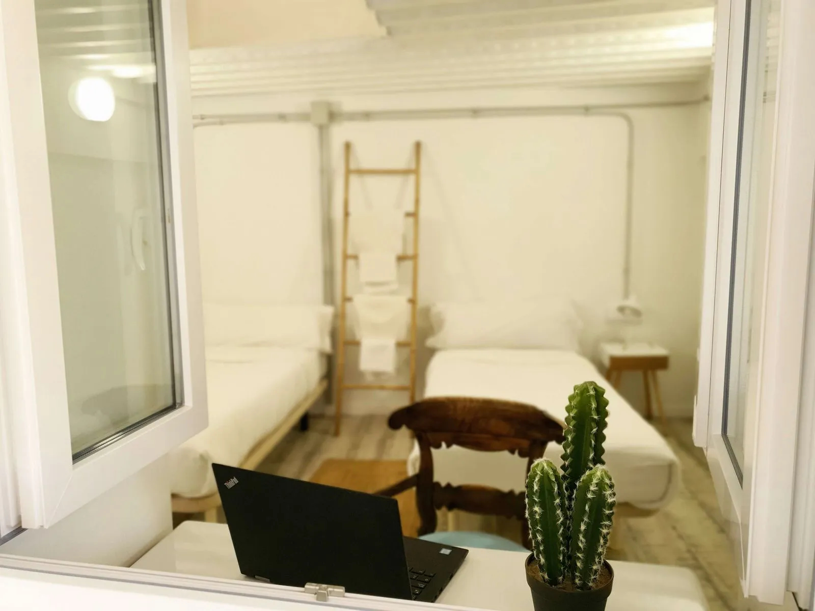 This twin bedded room overlooks a courtyard with a palm tree. This room has the possibility to have the beds attached or separate, please request in the booking coments how do you prefer them. The room has two single beds, a desk, a chair, two wardrobes and a fan. weekly cleaning and change of bed linen is included, as well as 24/7 access to the coworking. The bathroom is next to the room and shared by two rooms.