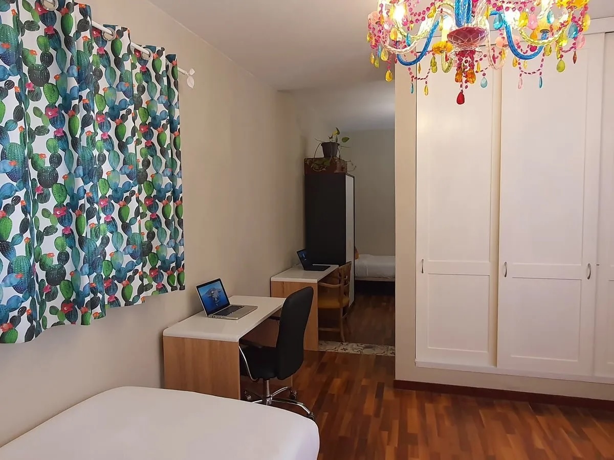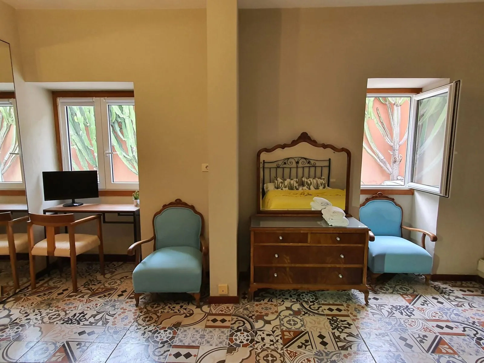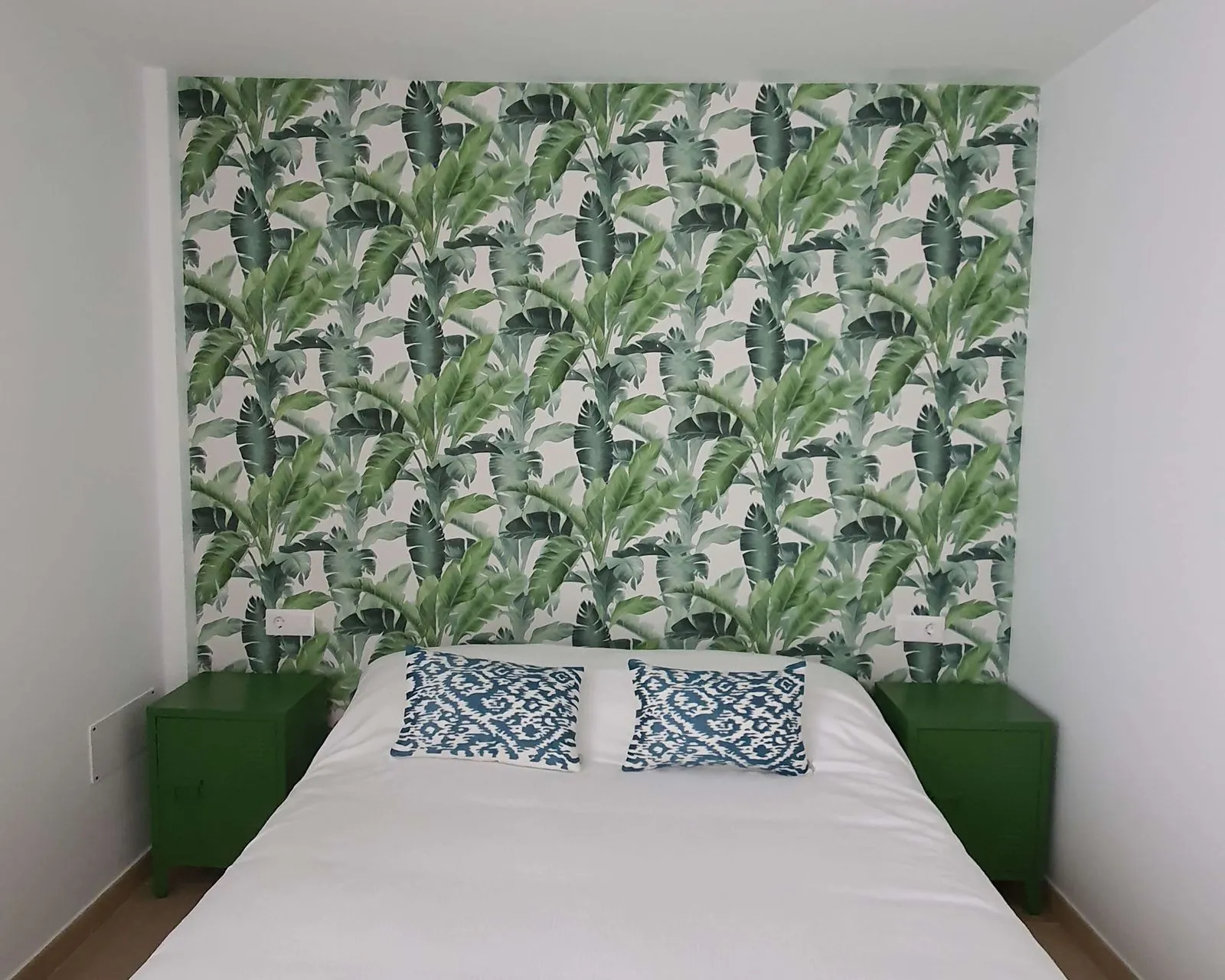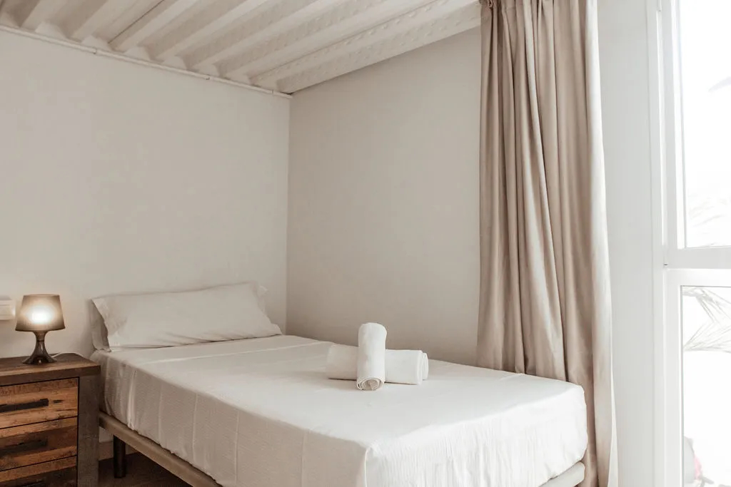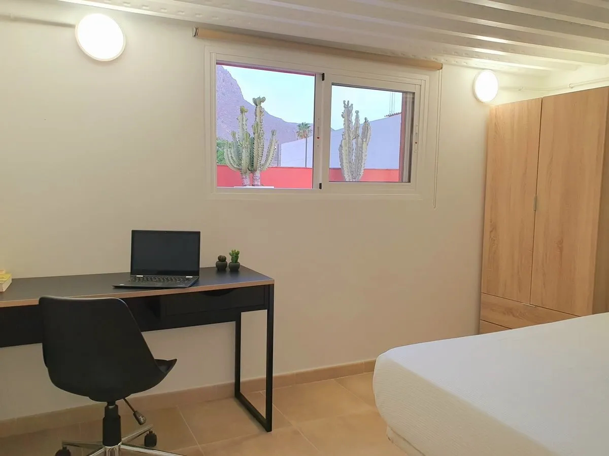 This twin bedded room overlooks a courtyard with a palm tree. This room has the possibility to have the beds attached or separate, please request in the booking coments how do you prefer them. The room has two single beds, a desk, a chair, two wardrobes and a fan. weekly cleaning and change of bed linen is included, as well as 24/7 access to the coworking. The bathroom is next to the room and shared by two rooms.