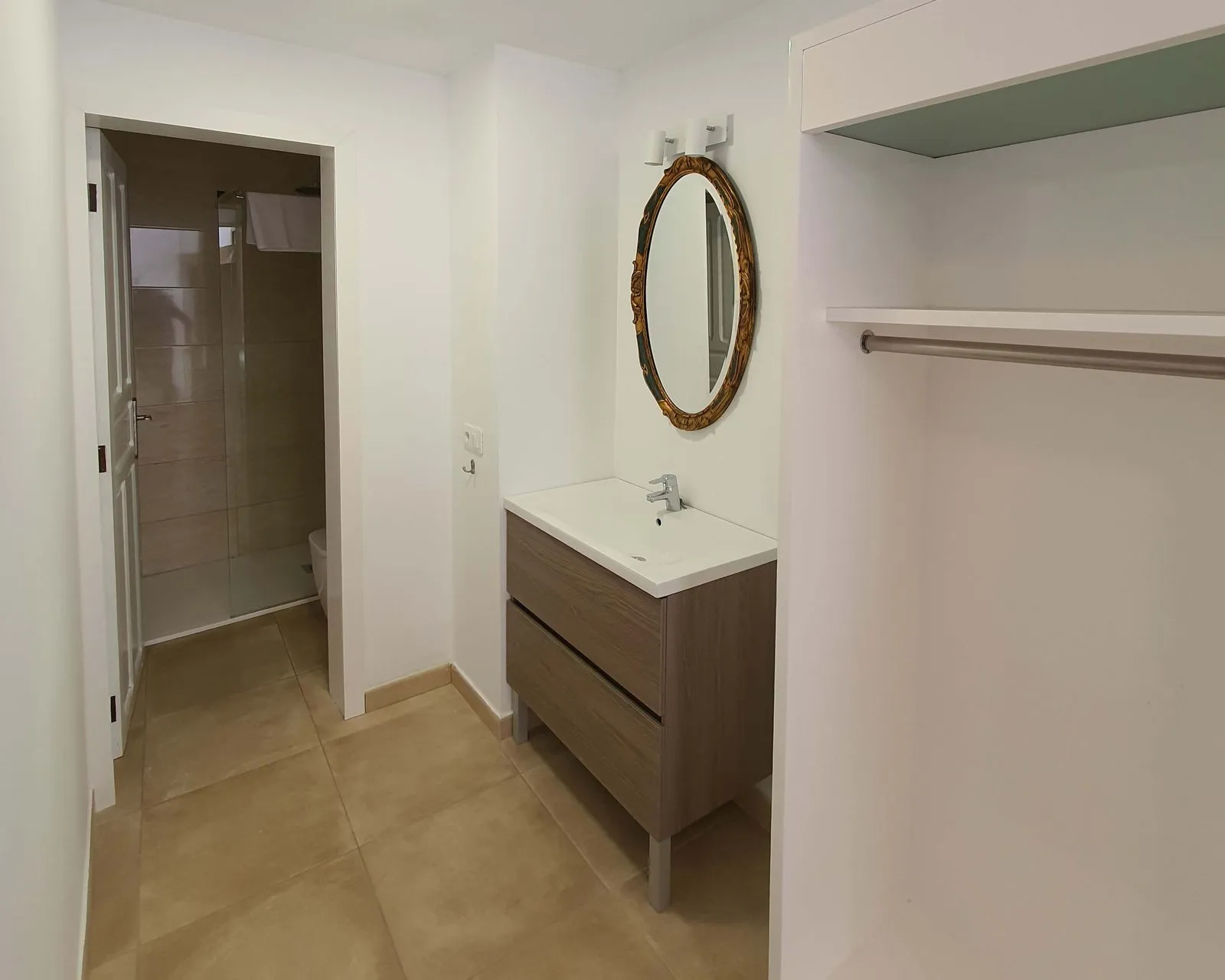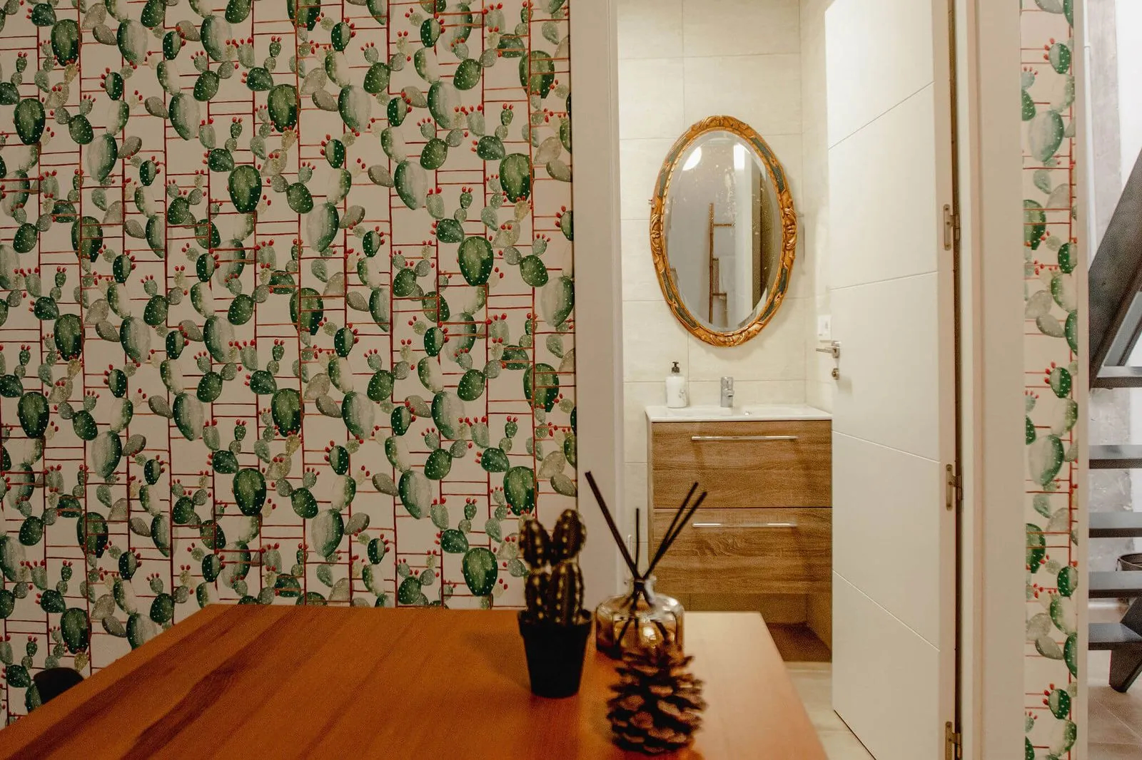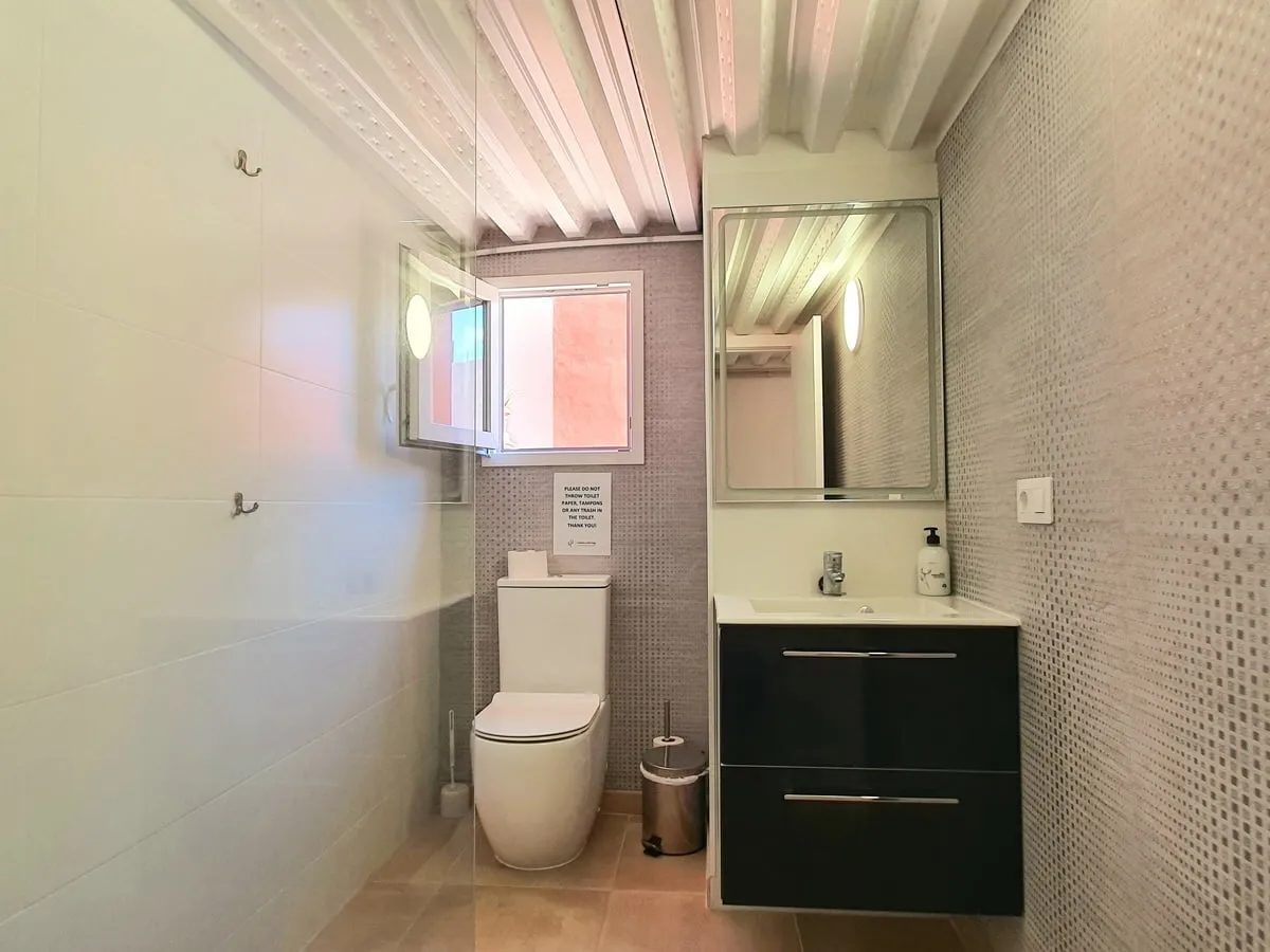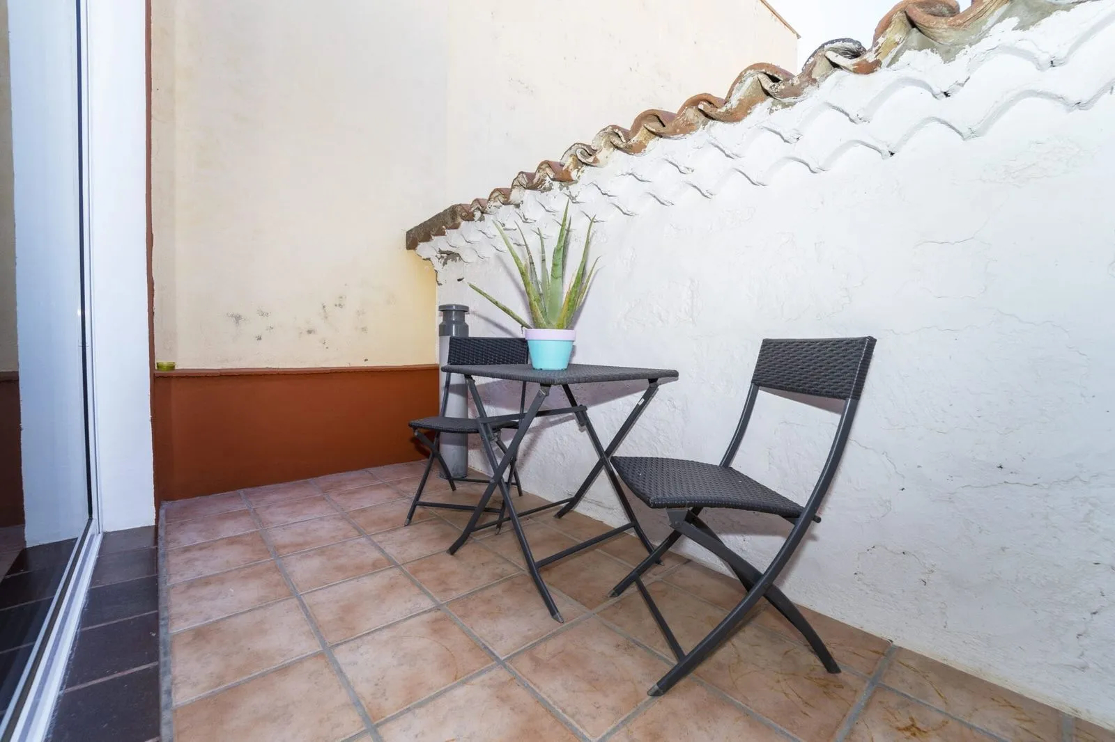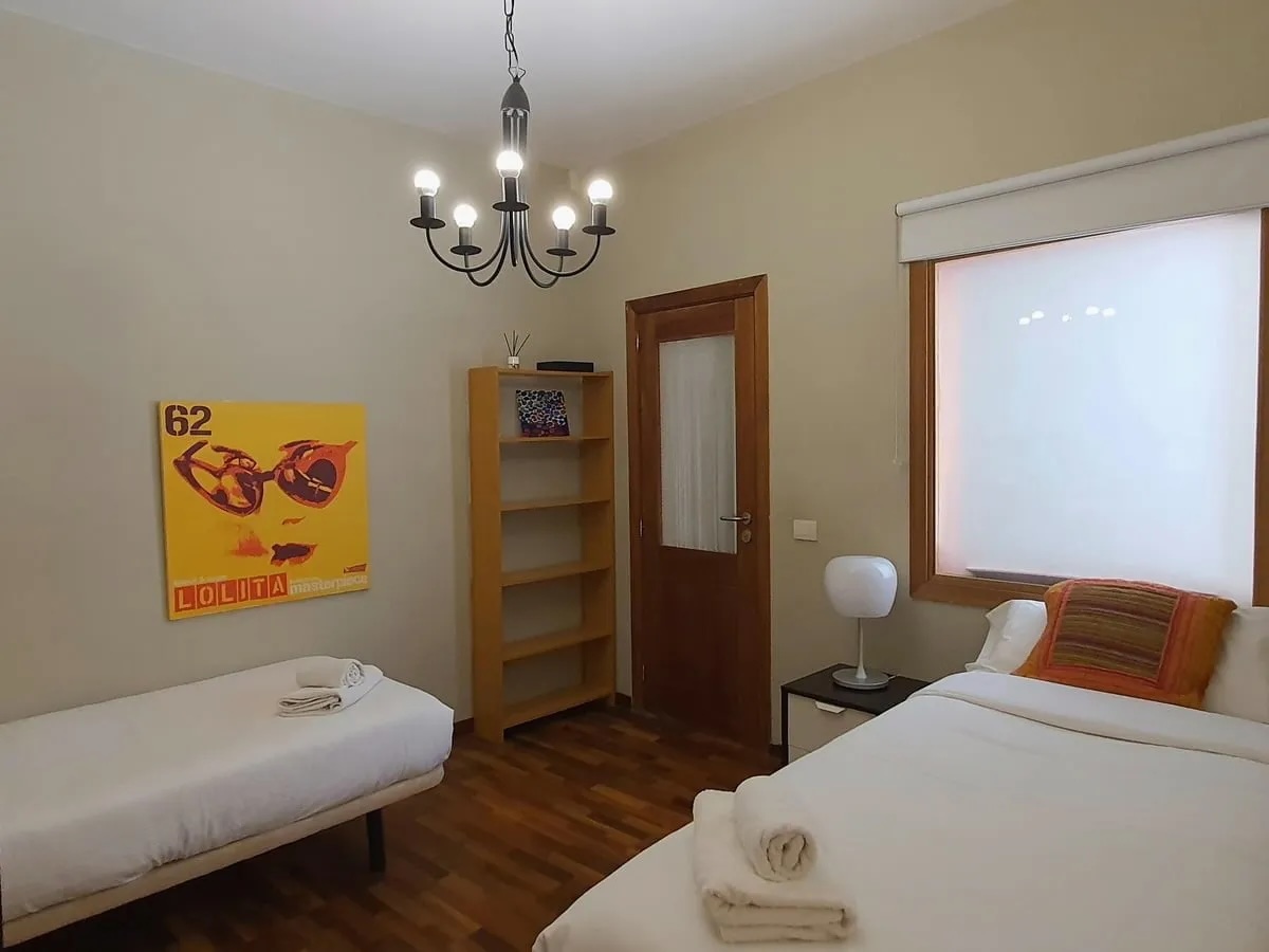 This twin bedded room overlooks a courtyard with a palm tree. This room has the possibility to have the beds attached or separate, please request in the booking coments how do you prefer them. The room has two single beds, a desk, a chair, two wardrobes and a fan. weekly cleaning and change of bed linen is included, as well as 24/7 access to the coworking. The bathroom is next to the room and shared by two rooms.